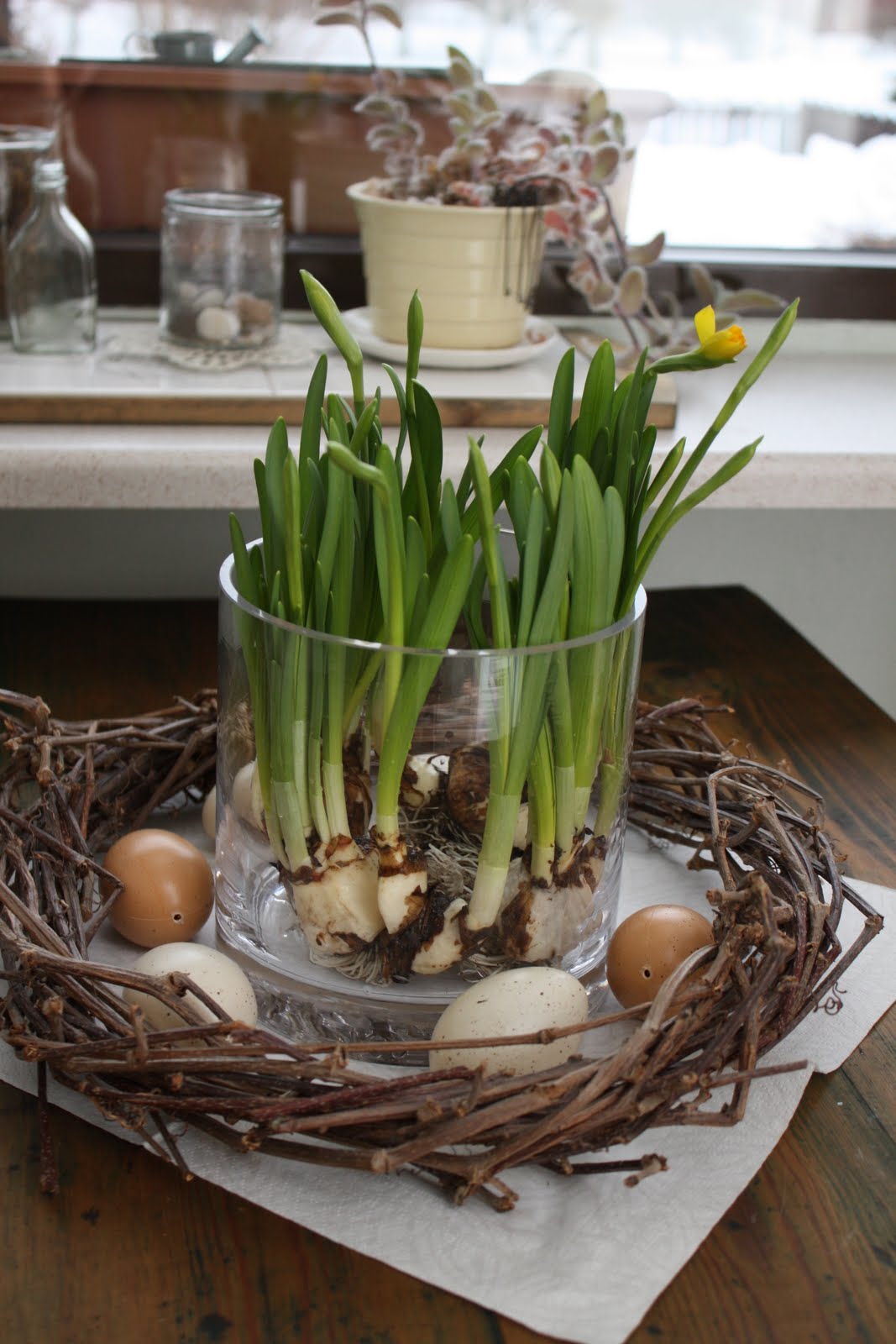Tässä hiukkasen kuvia meidän pääsiaiskoristeluista. Noi munat oli ihan kivoja, kun muistuttavat melko paljon aitoja kuitenkin, vaikka ihan muovisia ovatkin. Yläkuvassa harmittavasti just näkyy noi reiät, mistä oon vetäny pois ripustusnarut :( No olishan tietty aidoisskin se reikä mistä täytteet on puhallettu pois. Ja VILLIVIINI sopii AINA, vuodenajasta riippumatta. HEH! Tällaisia kuvia tällä kertaa näin pikaisesti laittettuna, mutta loppuviikosta lupaan laittaa lisää jotakin, kun on enemmän aikaa siihen. Lomalla kun tunnetusti on aina jotakin tekemistä. Yleensä kyllä mukavaa sellaista.