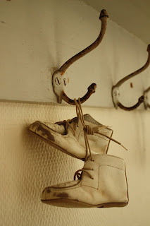 Muistin miehen vanhat valkoiset vauvatossut ja otin ne kaapin kätköstä esille "uuteen" hyllyyni. Olisipa omanikin vielä tallessa, mutta ovat tainneet mennä kiertoon sukulaisille silloin, kun jäivät minulle pieniksi.