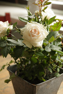 Oltiin ostamassa äitienpäiväkukkia, ja tämä valkoinen ruusu näytti niin kivalta peltisessä purkissaan, että hankin sen ihan itselle. Nyt se koristaa keittiön pöytää.
