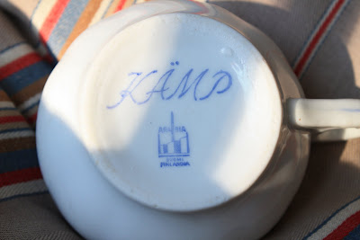 Aamupäivästä käväisin Puuhausissa. Siellä vietettiin teemapäivää "Sisusta mökkisi", sadeilma ei kuitenkaan pihakirppistä suosinut. Sisältä löysin kokoelmieni jatkoksi pikkuisen, kerman värisen, vihreä raitaisen emalimukin ja puna/beige raidallisen tyynyn.