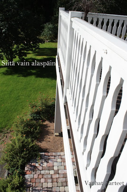 Tilda (5kk) sitten päätti lähteä urheilemaan kaiteen ulkopuolelle. Siinä on juuri kissan tassuille riittävä kaistale. Mutta lihava ei sovi olla, muuten keikahtaa heti alas ;) Sinnepä siis pikkukatti. Ja minä kamera kädessä käännyn selin, kun en pysty katsomaan. Ei kuulu tömähdystä vaan kynsien ääntä puupinnalla. Kätevästi pääsee Tilda tolppaa alas maahan ja jatkaa muina tyttöinä tallustelua talon nurkan taa. Huh!