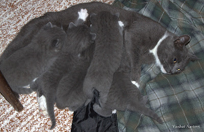 On kyllä hienot nuo näkymät teiltä kylälle. Taitaa kisunpennulla tosiaan olla sama isä kuin Tildalla ja Neidillä. Vähän raidallisempia vaan taitavat olla.:) -henu