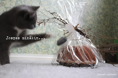 Aamusta lähdettiin kuusimetsälle. Viime vuonna upottiin polvia myöden lumeen ja nyt melkein samoin veteen. Kyllä on vaihtelevat kelit. Mies toi kuusen heti sisälle. Laitettiin se viileälle kuistille, siellä saa olla rauhassa pienen kissan kynsiltä. Aatoksi sitten olohuoneeseen vasta.