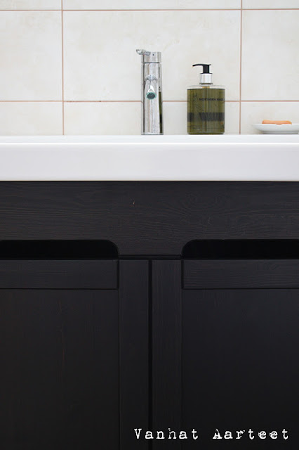Tuntuu olevan kylppärin sisustus ajankohtaista tällä hetkellä, jos sisustuslehtiin on uskominen ;). Niimpä kylppäriä vähän täälläkin. Meidän yläkerran pesutilat (joita ei peseytymiseen käytetä), ovat kivan yksinkertaiset. Tummanruskea laatta lattialla ja vaaleat isot laatat seinällä. Kalusteissa mustaa.